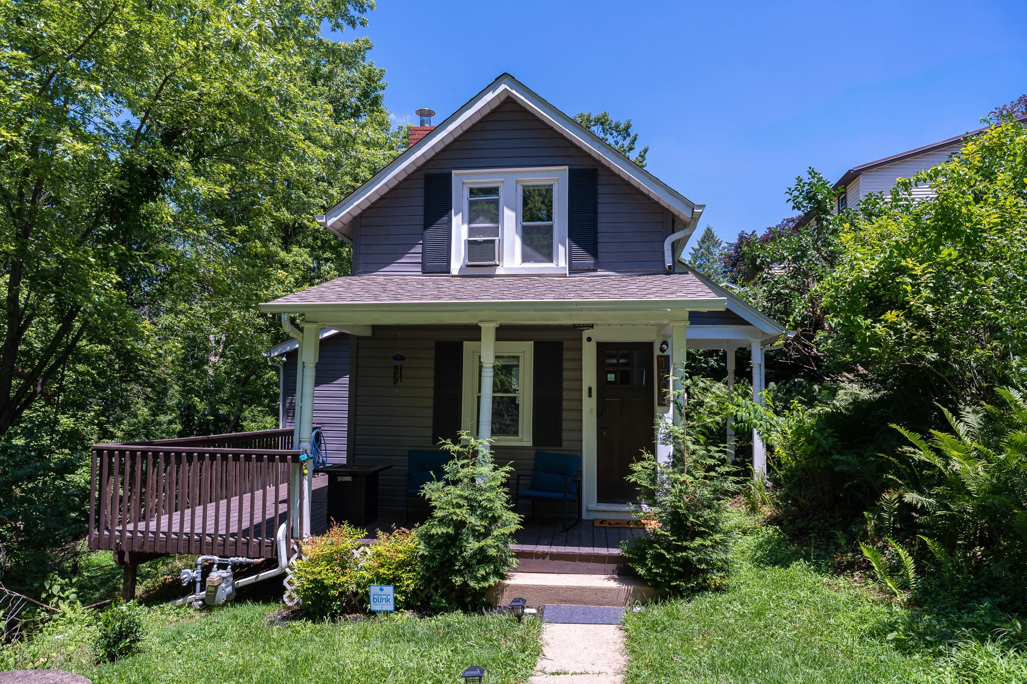 A two-story house with gray siding, black shutters, and a front porch surrounded by green trees and bushes, with a small grassy lawn and a concrete walkway leading to the front door.