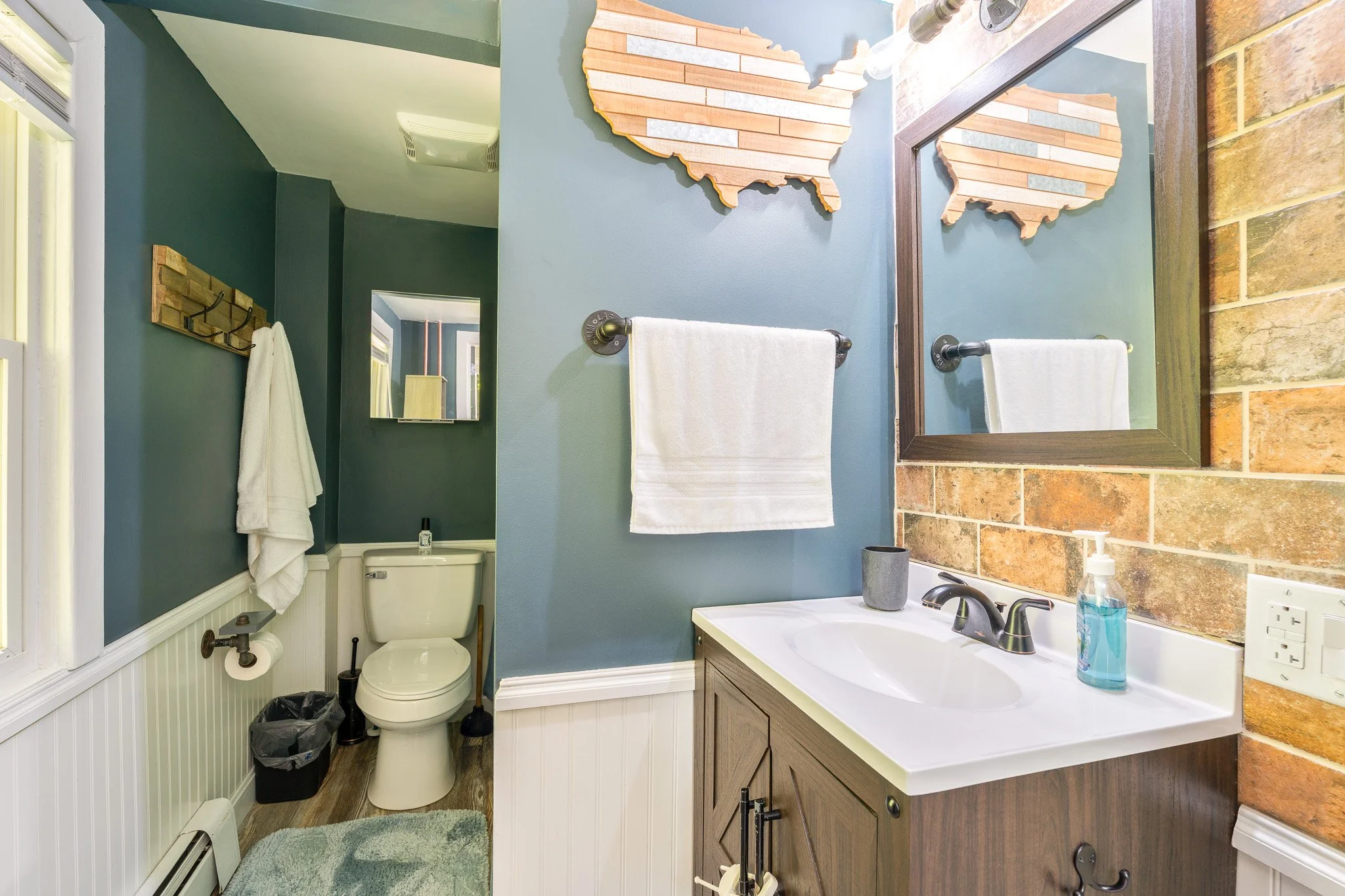 A bathroom with a teal wall, a white toilet, a small mirror, a vanity with a sink, a mirror, and wood decorations shaped like the United States on the wall.