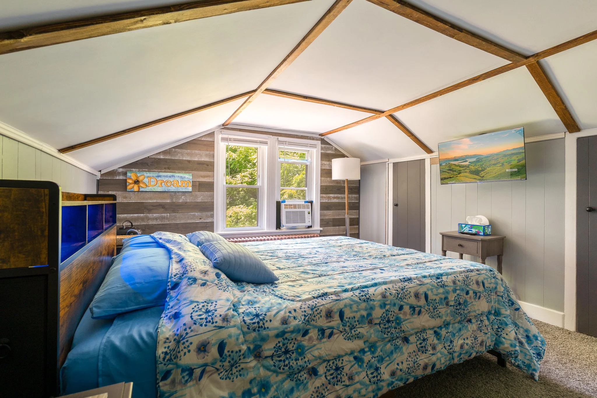 A cozy bedroom with a sloped ceiling, large window, wooden wall, and wall decor, featuring a bed with blue floral bedding, a small nightstand, a wall-mounted TV, and an air conditioning unit in the window.