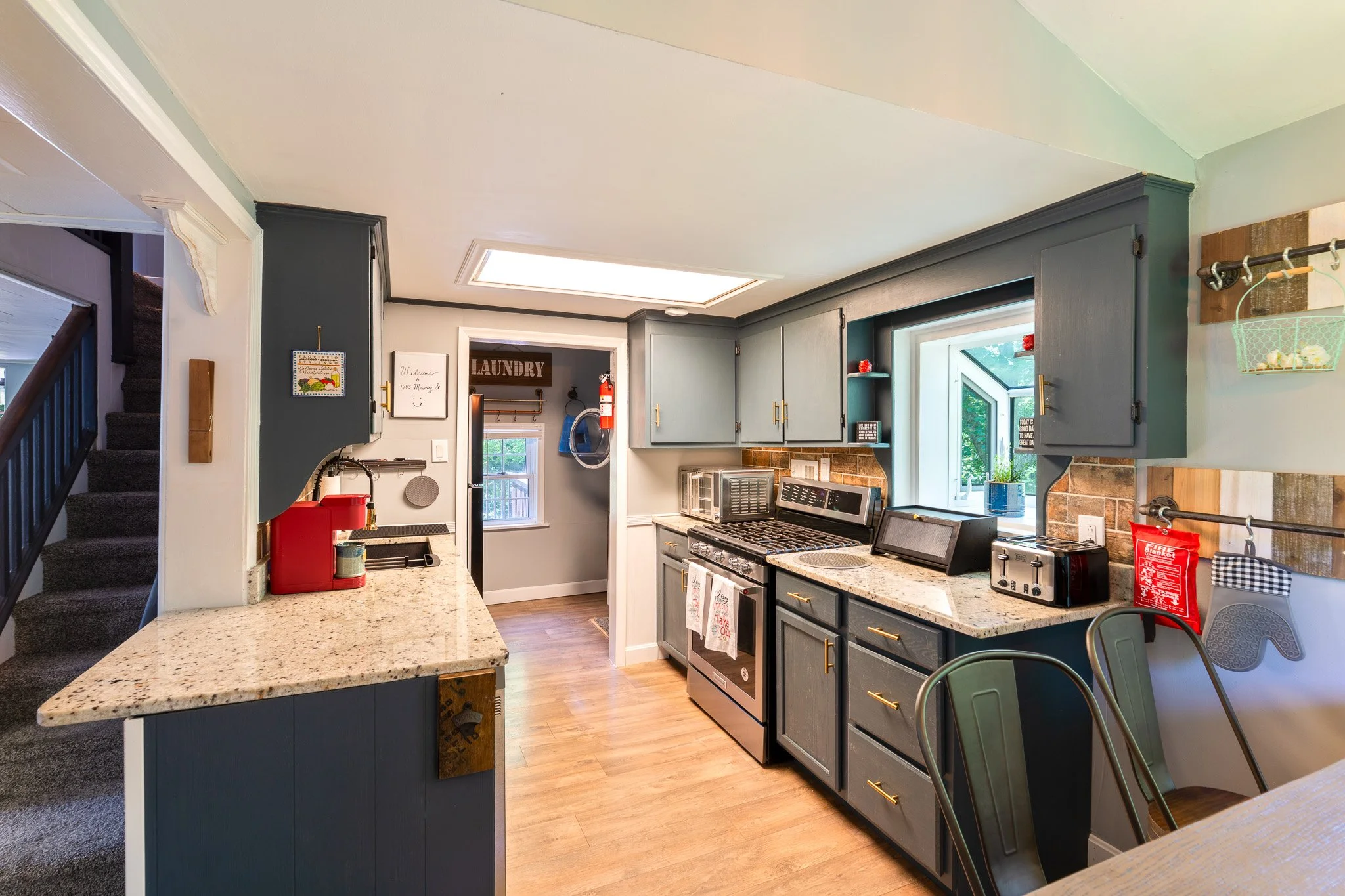 Kitchen with gray cabinets, granite countertops, and wooden flooring, seen from dining area with chairs. Appliances include microwave, toaster, and stove. Decorations include a fire extinguisher, a window, and wall signs.