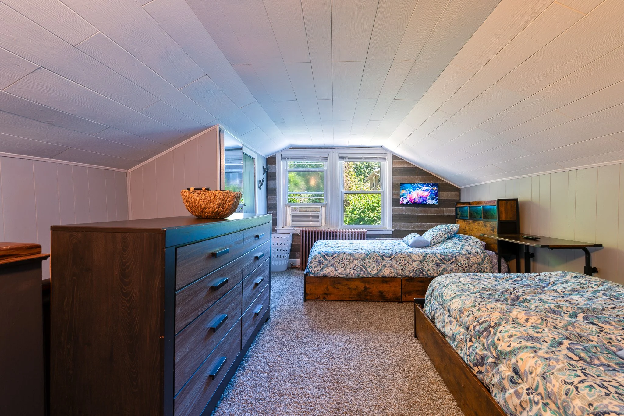 A cozy attic bedroom with two twin beds with patterned blue and white bedding, a dresser, a small side table, a window air conditioner, a window with greenery outside, a wall-mounted TV, and wood panel walls and ceiling.