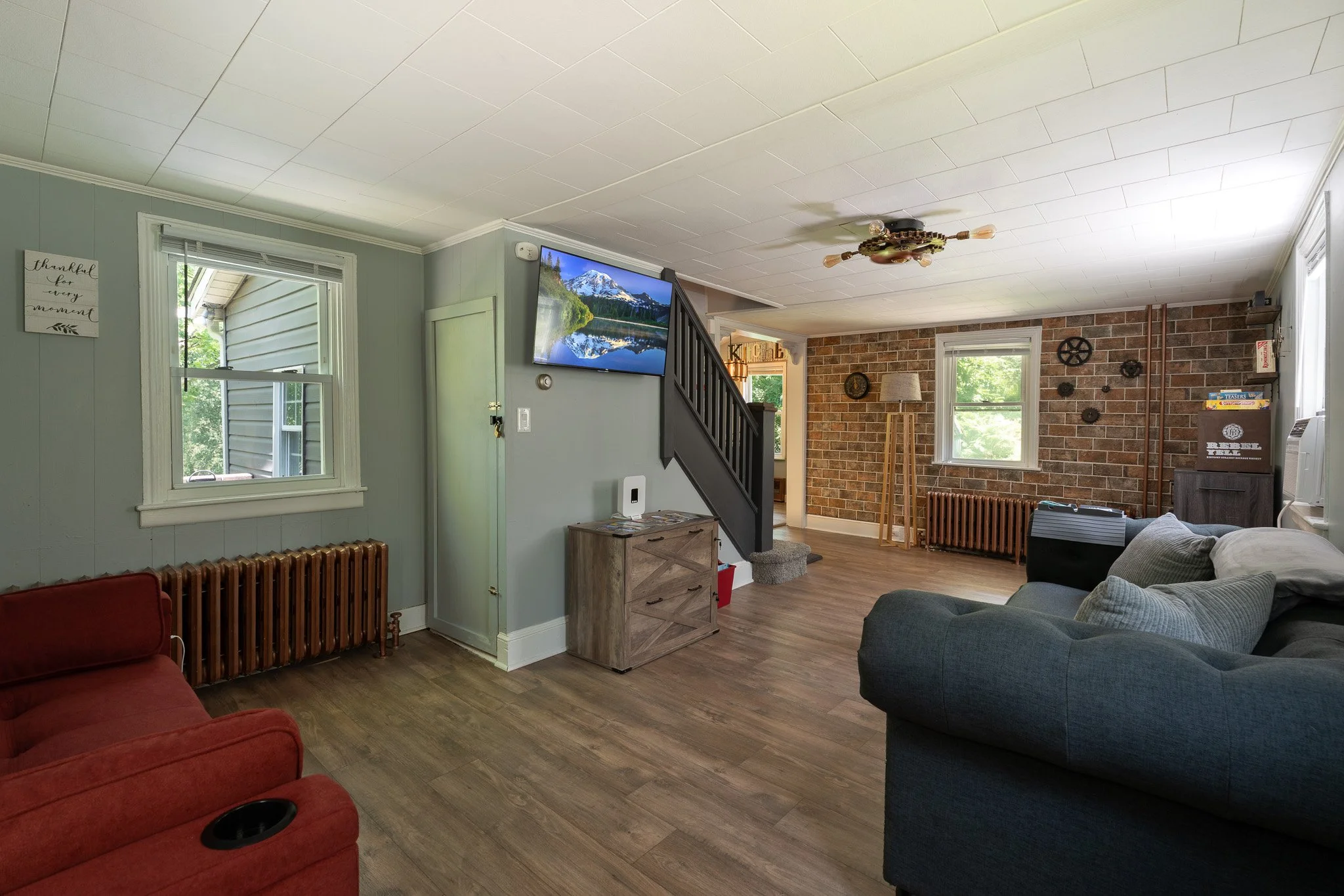 Living room with light blue walls, wood flooring, a red armchair, a gray couch with pillows, a wooden dresser, and a brick accent wall with a window. A TV is mounted on the wall, and there is a staircase leading upstairs.
