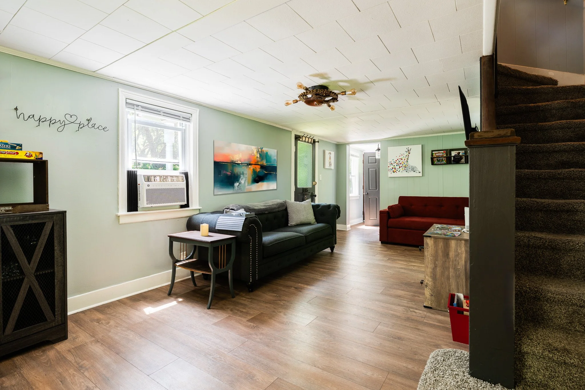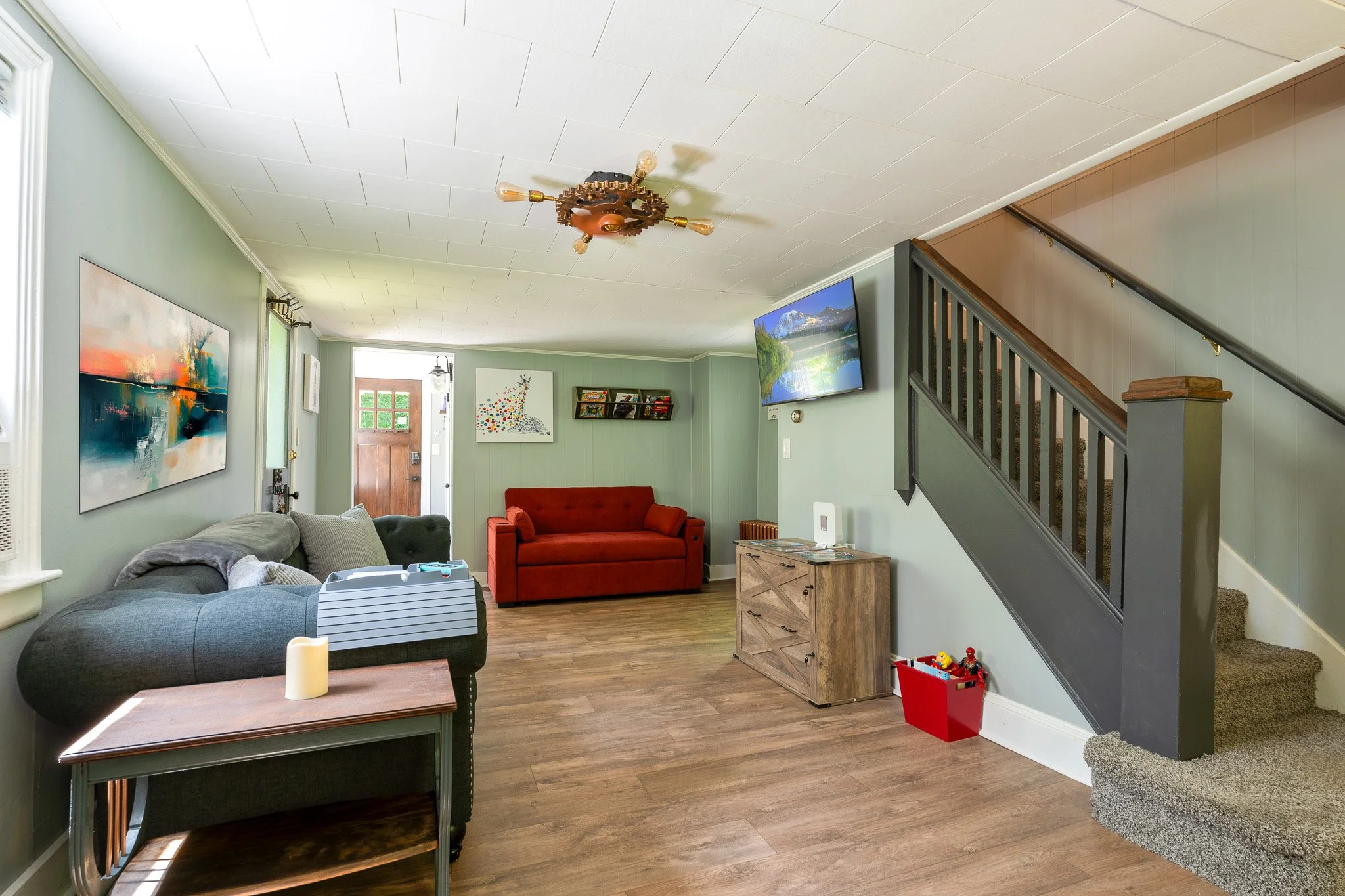 Living room with wood flooring, green walls, a gray couch, a red loveseat, wall art, a wall-mounted TV, staircase, and front door with window panes.