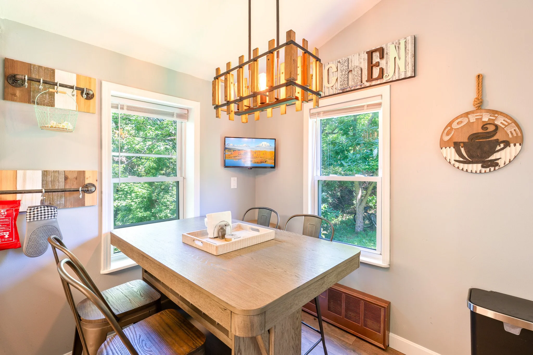 Dining area with wooden table, metal chairs, large windows showing green trees, wall decorations including a wooden sign spelling 'KITCHEN', a circular coffee sign, and a small TV