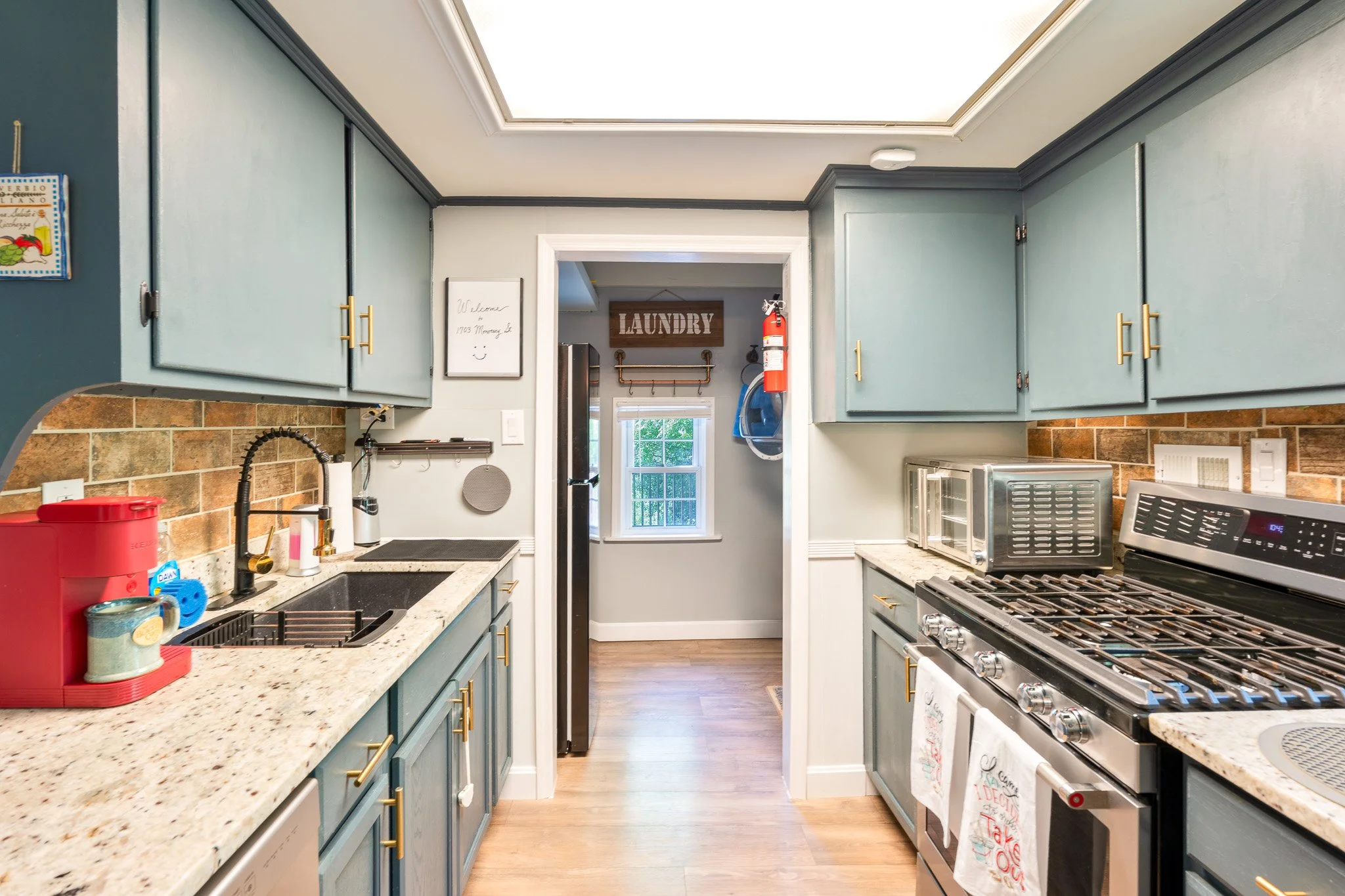 Kitchen with light blue cabinets, beige granite countertops, brown brick backsplash, stainless steel appliances, and a window at the end of the room.